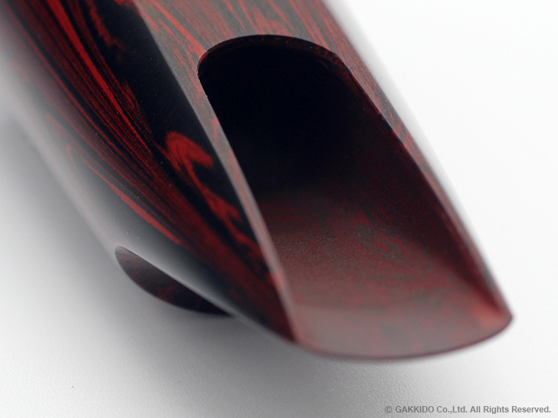 【スタッフのコメント】 マーブルハードラバーということもありブラックとレッドが交じり合った独特のルックスが目を引きます。シャンクの突起部分はもう少し丸みと厚みがあった方が手に優しい気はしますがボディのロゴを含め独創的なデザインです。見た目はユニークですが音色は奇をてらったものではなく伝統的なロールオーバーバッフルにラージチェンバーの組み合わせでテナーらしさのある上質なジャズサウンドが楽しめます。バッフルの先端にはややステップのあるクレセントバッフルがあり、早い段階からサイドウォールも彫り込まれています。先端部分にやや高さはありますが全体的には低めのバッフルでチェンバーに向かって大きく彫り込まれており、テーブルの下側を含めラウンド状に彫り込まれています。チェンバーが大きめな分、広がりのあるタイプのマウスピースかと思いきや意外と音にまとまりがあり密度を持って鳴らせます。ラージチェンバーではありますがバッフル先端からチェンバーの中心に向かって少し絞り込むようなバッフルデザインになっていますのでそのことが影響して音にまとまりが出来ているのかもしれません。柔らかさ重視で音がファットに広がるタイプというよりかはややフォーカスした音色の周りにファットさのある音色がブレンドされるタイプのマウスピースに思います。そのため、音が広がり過ぎてフォーカスが甘くなったり音が浅くなったりすることも無く、適度に音の芯を持ったままスムーズに鳴らすことができます。また、マーブルハードラバーということもあってか音色の柔らかさが独特で、言葉では表現が難しいですが音にまろやかさがあるといいますか特有の丸みのあるファットで柔らかな音色を出すことができます。基本的には落ち着きのある柔らかな暖かみのある音色ですが、息を強めるに入れればより音がまとまり高音域ではテナーの艶のあるサウンドが出せてパンチも効かせることができます。レスポンスにも優れ、艶のある丸みを帯びた明るめのサウンドも作ることができます。低音域では芯のある音の周りにファットさがあり図太く鳴らせますし、サブトーンも十分に出すことができます。カサカサとした枯れたサブトーンというよりもやや丸みを帯びた上品なサブトーンに思います。どちらかというと現代的なサウンドキャラクターに思いますがユニークさを持ちながらも質の高い音色が楽しめるマウスピースだと思います。ハンドフィニッシュによる精度も高く吹奏感も心地よく、一般的なラバーとはまた違った音色でありながらもテナーらしい図太いサウンドを持った上質なジャズサウンドが楽しめるマウスピースをお探しの方にお薦めです。