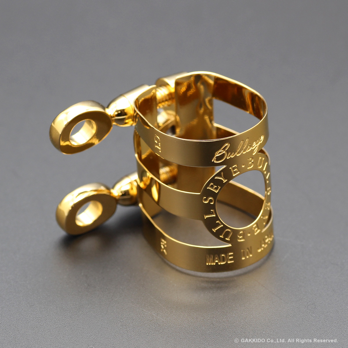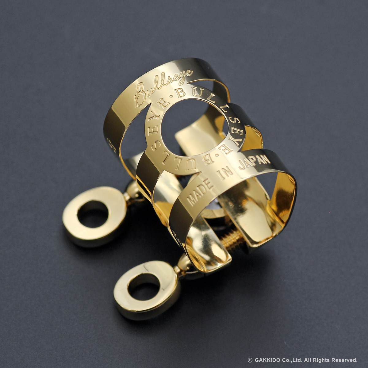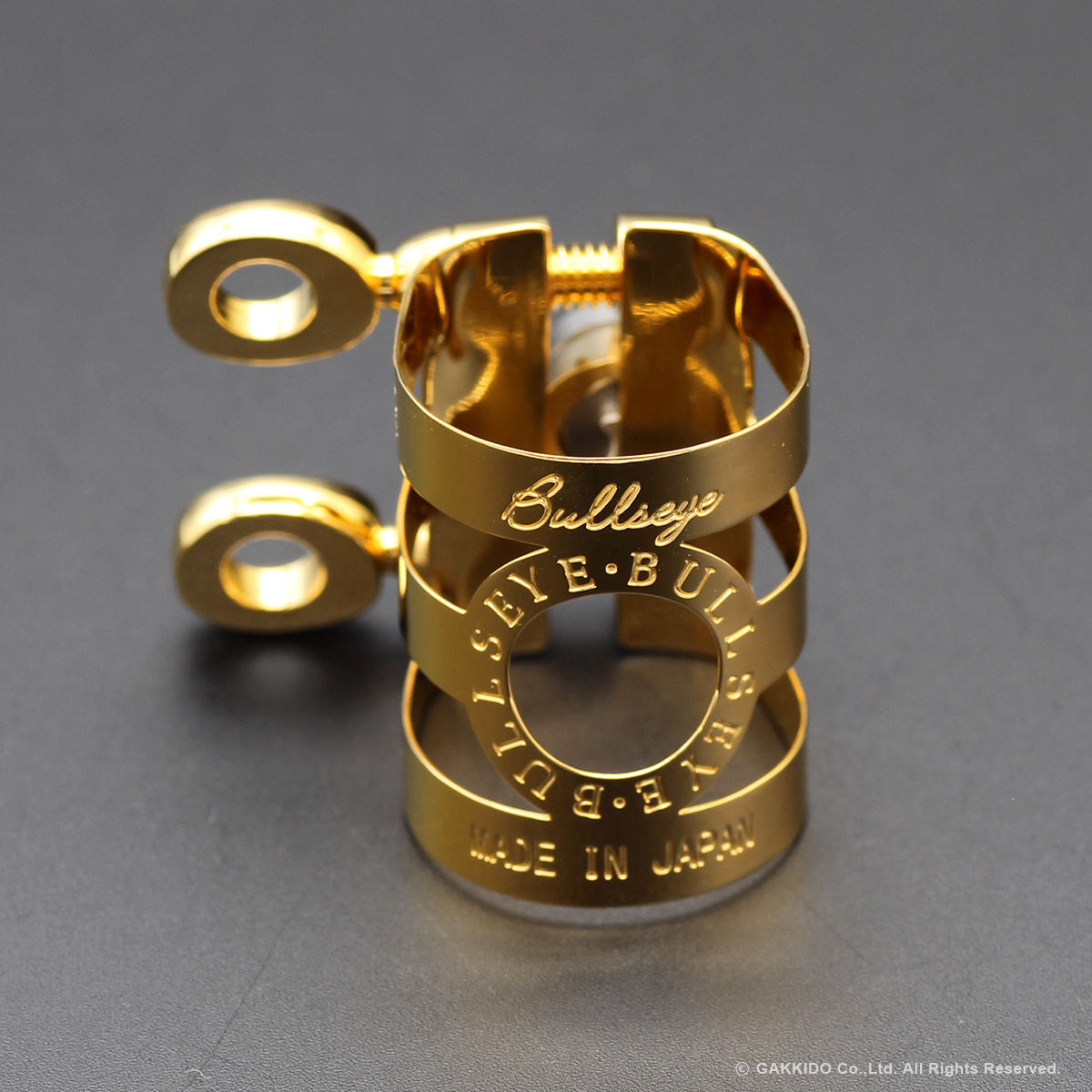 BULLSEYE(ブルズアイ) ブルズEX テナーサックス用リガチャー 対応:デイブ・ガーデラメタル 金メッキ仕上げ 特注 3-Band仕様 バランサーを採用した独自設計のこだわりハンドメイドリガチャー!ブルズリガチャーは完全ハンドメイドで、従来ある純締めリガチャーに特殊加工されたウェイトを付ける事により、絶妙なバランス感、心地よい吹奏感を伴って、リードの振動、豊かな倍音を最大限に引き出します。また、多くのリガチャースクリューは鋳物による接合で作られていますが、ブルズアイのリガチャースクリューは真鍮削り出しのスクリューを採用し、振動を遮らず、スムーズに息のエネルギーを活かすよう細部までこだわって作られています。別売りのバランサーを使用することでウェイトを変えることができますので、好みに応じて抵抗感や音色の微調整を行うことができるのもこのリガチャーのユニークな特徴のひとつです。