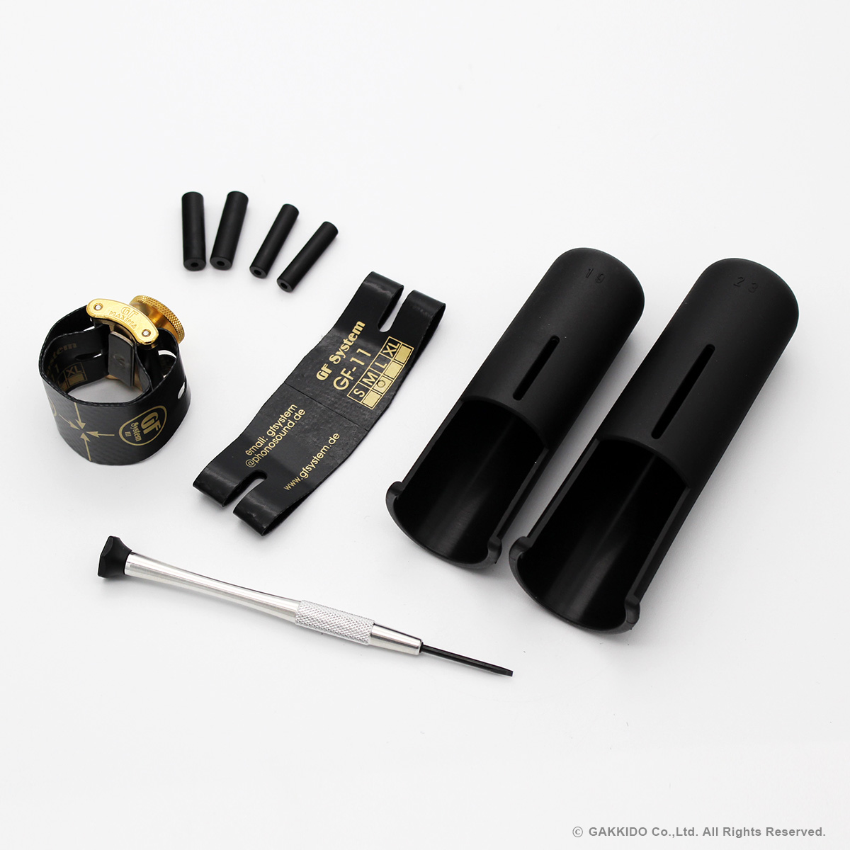 ※11Mと11Lの2種類のリガチャーベルトが同梱されており、皮を付け替えることで用途に合わせてどちらでも使用でき、幅広いテナーメタルに対応することが可能です。また、付属のキャップも19番と23番の2点が付属しています。 ※対応メーカーであっても一部のマウスピースに対しては付属のサイズ調整用パーツに交換してご使用いただく必要があります。